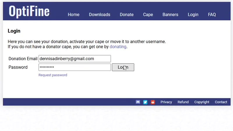Optifine login page